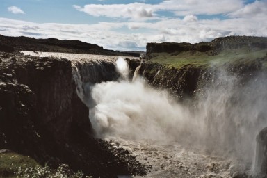 Der Detifoss ist ein beeindruckender Wasserfall, der in zwei Stufen in einen Canyon stürzt. Man kann sogar ganz nah ran gehen. |